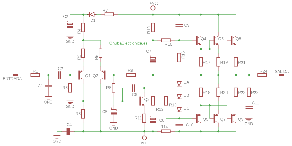 La salida está constituida por transistores complementarios TIP140 y TIP145 para lograr así la potencia deseada. Los transistores BD139 y BD140 conforman también un par complementario cuya finalidad es excitar la etapa de salida.