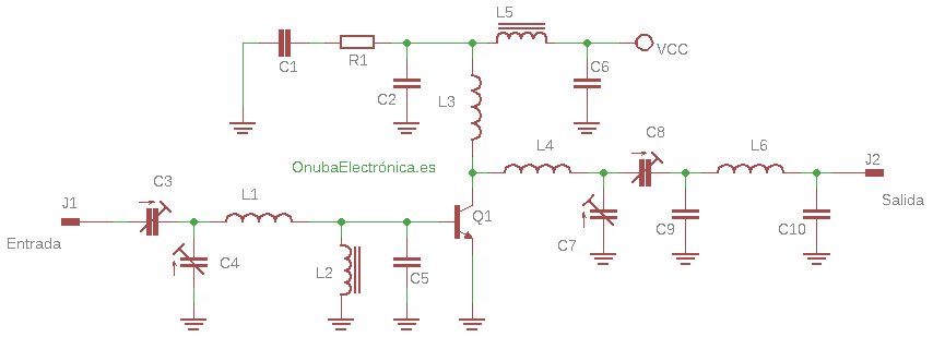 Armar el amplificador sobre un circuito impreso de fibra. Es indispensable usar plaquetas de doble capa, reservando una de ellas para las pistas del circuito y la otra como plano de masa.