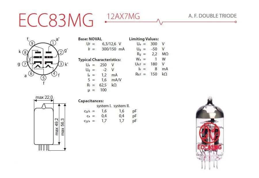 La 12AX7 o ECC83 es una válvula doble triodo de base noval B9A con un elevado grado de ganancia; es un triodo con alta ganancia (un factor típico de amplificación de 100) y baja corriente de placa especializada para amplificar señales de audio de baja intensidad.