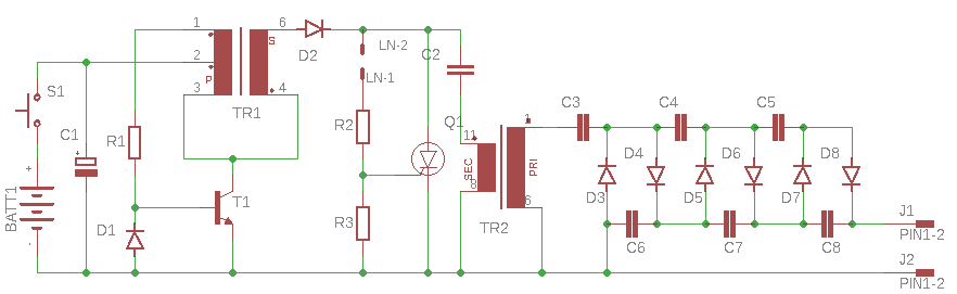 Este conversor de voltaje de 9V a 13.5kV, está formado por un inversor, en torno al transistor, el cual provee pulsos de 150V al circuito formado por el tiristor y el condensador en serie con el transformador T2.