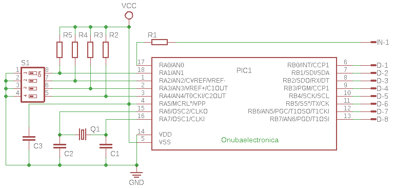 R1.., R5 – 10kΩC1, C2 – 18pFPIC1 – PIC16F84A