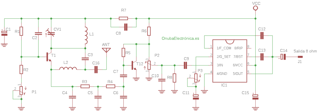 El transistor T2 conforma una etapa de preamplificación que acopla a la etapa posterior, un amplificador de audio que provee una señal aceptable sobre una impedancia de 8Ω.