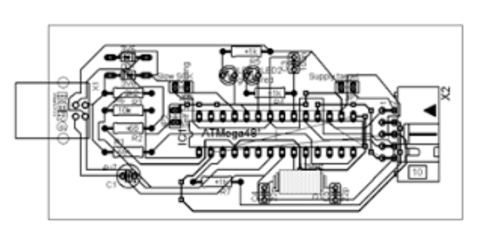 Trabaja a través del puerto USB; esto se logra a través de un procesador ATMEGA 8.