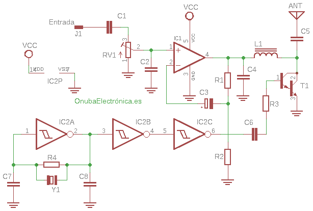 El circuito es muy simple; consta de tres etapas: oscilador (portadora), modulador (amplificador de audio) y mezclador (transistor de potencia).