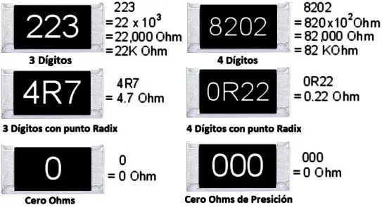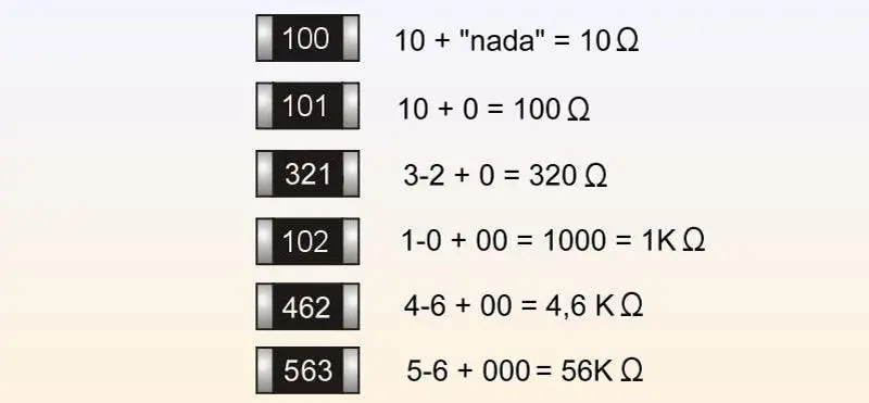 Las más fáciles de leer son las que tienen códigos numéricos de 3 cifras. En ellas, los dos primeros dígitos son el valor numérico mientras que el tercer dígito es el multiplicador, es decir, la cantidad de ceros que debemos agregar al valor. Es un sistema similar al que se usa en los capacitadores.