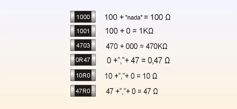 Con el sistema de 4 cifras, el valor de resistencia menor que podemos codificar es de 100Ω y que equivale a ver impreso en la resistencia: 1000 (100 + ningún cero).