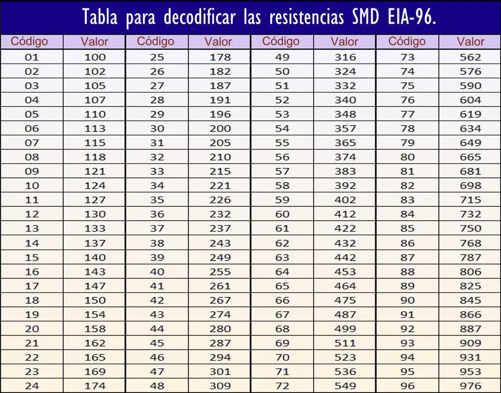 Tabla para decodificar las resistencias SMD EIA-96