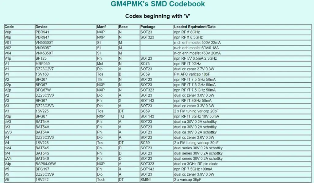 Existe un catalogo denominado ‘SMD codebook’ el cual aporta mas de 3500 elementos SMD que ha sido desarroyado por el radioaficionado norteamericano R.P Blackwell (GM4PMK).