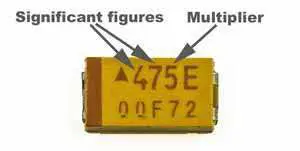 • Marcas abreviadas de condensadores: los condensadores más pequeños solo pueden tener espacio para unas pocas cifras impresas como un código para el valor. Este código de marcado de condensador usa tres caracteres.Tiene muchas similitudes con el sistema de código de color adoptado para las resistencias, pero sin la parte de color del esquema de codificación. Las dos primeras figuras se refieren a las figuras significativas, mientras que la tercera actúa como un multiplicador. El valor del condensador se indica en picofaradios para los condensadores de cerámica, película y tántalo, pero para los electrolíticos de aluminio, el valor se denota en microfaradios