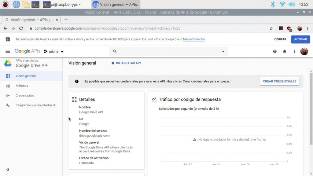 Aquí nos cargará una página que nos preguntará si queremos habilitar la API de Google Drive. Pinchamos en Habilitar y nos deberá aparece una página donde se ven las estadísticas de peticiones a la API de Google Drive. Os dejo a continuación un pantallazo con lo que os tiene que salir. Si veis esto, ya lo tenéis todo listo para usar rclone con Google Drive.