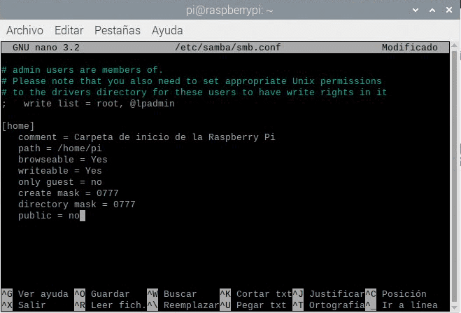 Con esto compartiremos la carpeta /home/pi en la red SMB. Es una configuración por defecto para que podamos acceder a todos los archivos y carpetas de esa carpeta con el usuario pi y con una contraseña, que por defecto será la de ese usuario. Pero vamos a ver que significa cada parámetro y que podemos poner en estos para configurarlo.