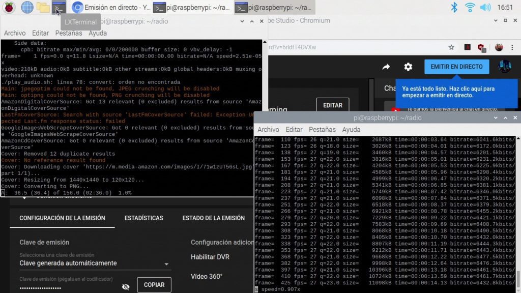 Para terminar, nos queda abrir el reproductor de música y el programa para enviar el vídeo al servidor de YouTube y darle al botón de Empezar transmisión en la web de YouTube una vez que veamos que todo funciona correctamente para tener nuestra radio funcionando.
