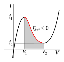 curva similar a una curva característica del diodo túnel. Tiene una resistencia diferencial negativa en la región de tensión sombreada, entre v1 y v2 .