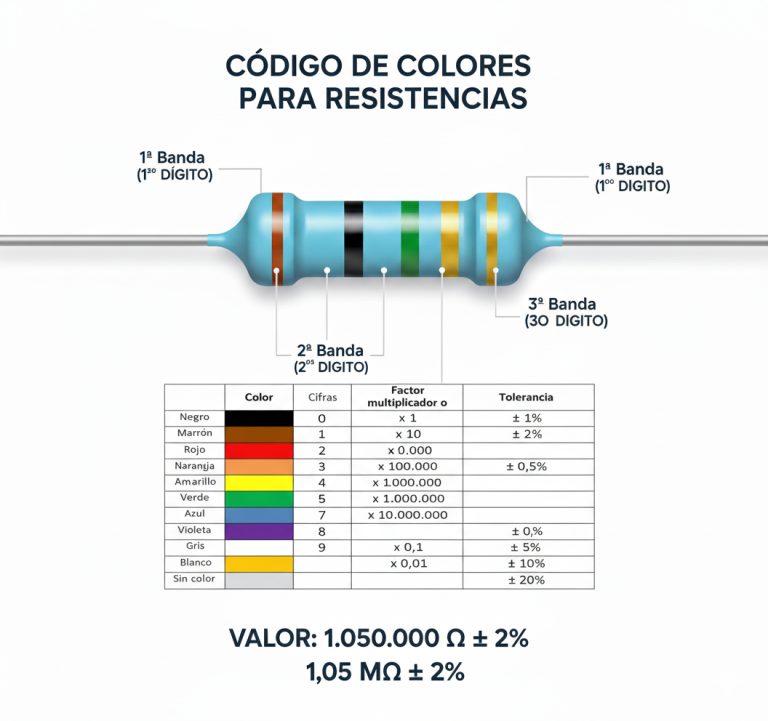 Las resistencias convencionales usan bandas de colores para indicar su valor. La mayoría tienen 4 bandas, aunque existen versiones de 5 y 6 bandas para mayor precisión.